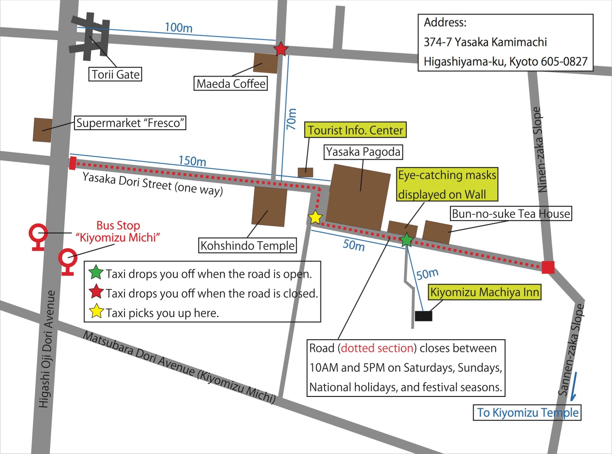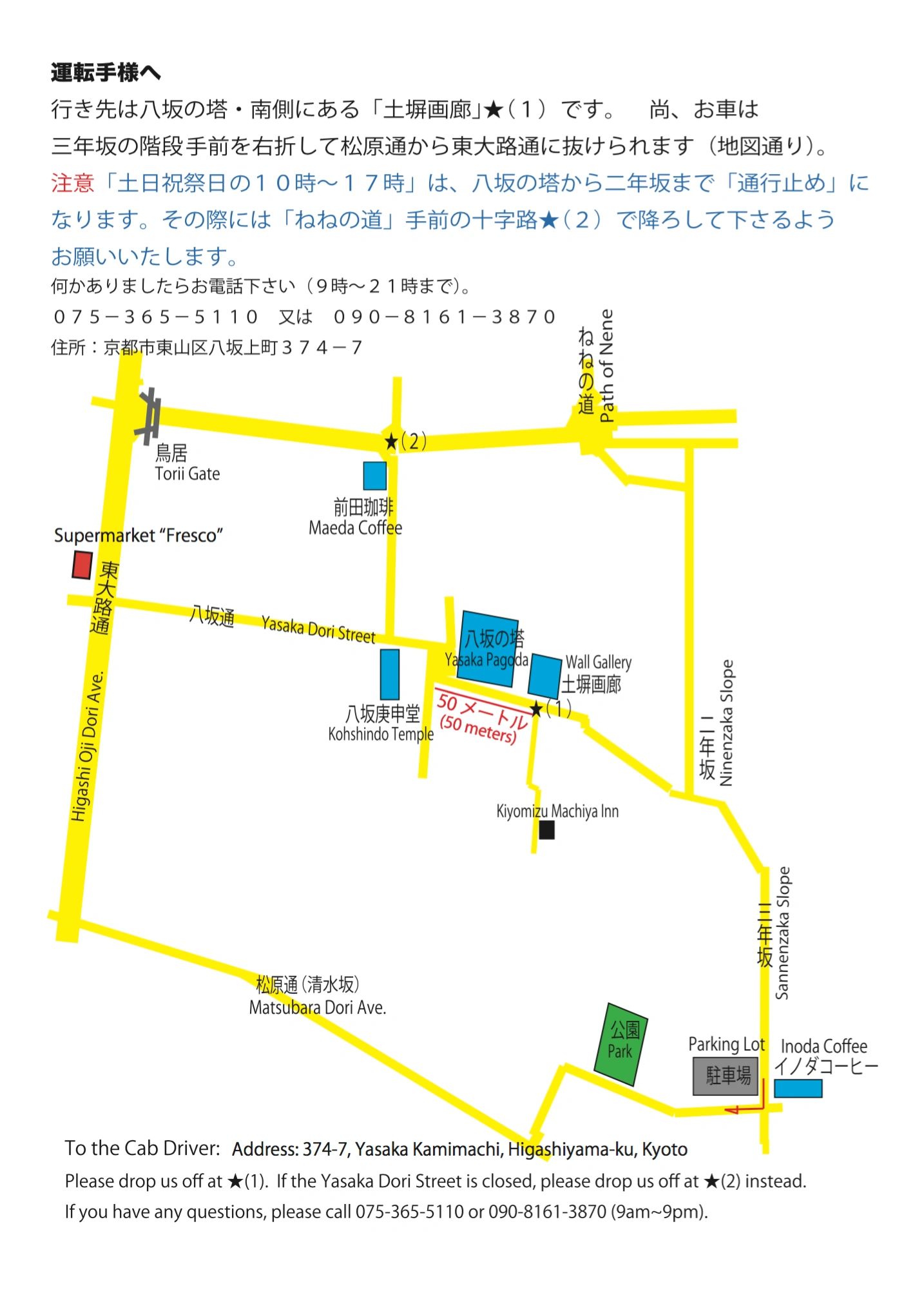 Please copy this map and show to the taxi cab driver. From Kyoto train station, it takes approximately 15 minutes or about 2000 yen.